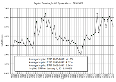 While it is tempting to continue to dissect last year's numbers, it is healthier to turn our attention to the future. It is why I have increasingly moved away from using historical risk premiums, like the 4.77% premium that I computed by looking at the 1928-2017 return table, and towards implied equity risk premiums, where I back out what investors are demanding as a premium for investing in stocks by looking at how much they pay for stocks and what they expect to generate as cash flows. (Think of it as an IRR for stocks, analogous to the yield to maturity on a bond). At the start of 2018, putting this approach into play, I estimated an equity risk premium of 5.08% for the S&P 500: