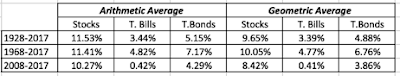 Putting 2017 in perspective, adding the 2017 returns for stocks, T.Bonds and T.Bills to the historical data yields the following historical annual average returns for the three asset classes: