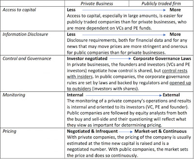To understand both transitions, the more-common private to public and the less-frequent pubic to private, let us consider the trade off between being a private business and a publicly traded company, from the perspective of the business: