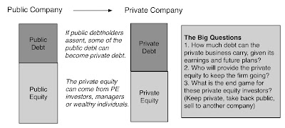 The key questions then become what mix of debt and equity to use, how to raise the private equity needed to get the deal done and what the ultimate end game is in the transaction. Specifically, you may take a company private, because you want to control its destiny fully, and keep tit a private business in perpetuity. More often, though, the end game is to make the changes that you think will make the company more attractive to investors, and either take it back public or sell it to another public company.