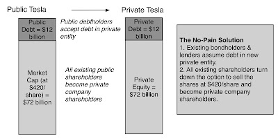 1. The No-pain solution: Musk, in his Tuesday tweets, seems to offer a solution, which, if feasible, would be relatively painless. In his set up, existing shareholders will be allowed to exchange their shares in Tesla, the public company, for shares in Tesla, the private business, and those shareholders who are unwilling to take this offer will sell their shares back to the company at $420/share. In the extreme case, where every existing shareholder takes this offer and if existing debt holders are willing to continue to lend to the new private enterprise, Tesla will need no new funding: