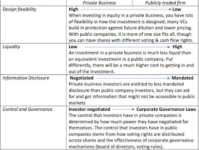In the classic structure of going public, private firms raise money from venture capitalists who accept less liquidity, but structure their equity investments to often get more protection and a bigger say in how the company is run. It is the desire for liquidity that makes venture capitalists push private companies to go public, so that they can cash out their investments. To be able to negotiate better disclosure and control, private company investors have to be investing larger amounts, and it is one reason that regulatory authorities have been wary of allowing small investors to invest in private companies, since they may end up with the worst of all worlds: illiquid investments in businesses, where they have no say in how the company is run, and no information about how well or badly it is doing.